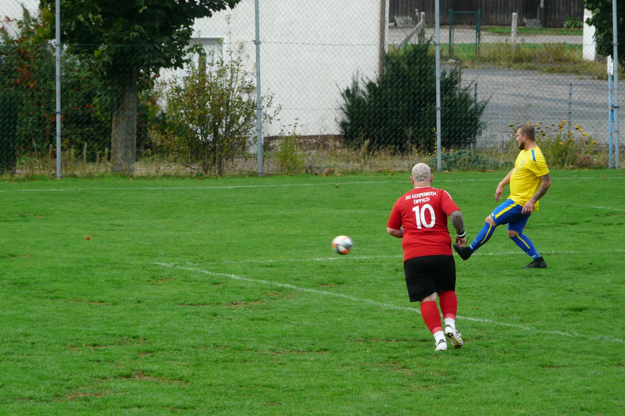 Reißig appellierte, den Fokus weiterhin zu halten. Nach Spielen wie in Ütteroda und Frauensee, könnten es sich die Eckardtshäuser nicht leisten, erneut ein Leistungshoch aus der Hand zu geben. Das Vorhaben ließ sich nahtlos umsetzen. Gospenroda III fand nicht das benötigte Gaspedal, auch wenn sie nun mehr offensive Nadelstiche setzten. Marvin Berger wurde im Sprint von Tommy Mengis abgedrängt. Vorne blieb der SV 49 brandgefährlich, kam mit Seiler über links, der mit dem Außenrist in den Fünfmeterraum legte und dabei Bachmann durch die Hosenträger schoss. Zirpel hielt auf der Linie den Fuß dran und stellte auf 4:0 (50.). Die Reißig-Elf hob sich durch den permanenten Wechsel von Angriffs- und Ruhespiel, guter Zweikampfführung, mutigen Ideen und richtigen Laufwegen hervor. So auch Steven Neumann, der Tommy Mengis' hohen Laufpass erkannte und das Leder mit dem Oberschenkel über den herausgeeilten Luca Bachmann hob, um abgezockt ins Tor zu schieben (5:0/53.). Gospenrodas Hintermannschaft schien nun zu zerfallen und bot bei Flanken und Steckpässen alle Räume, die der SV 49 brauchte und erkannte. Zudem stellte Martin Reißig positionell um, brachte Toni Berndt für die Position des „Letzten Mannes“ und schickte Mengis neben Jonas Manß in die Sturmspitze. Mengis, der zwei Tage zuvor bei seinem Alte-Herren-Debüt gleich mal einen Hattrick im Derby gegen Marksuhl erzielte, machte mit Übersicht und einem Assist direkt auf sich aufmerksam. Kaßner war Nutznießer des Querpasses und zielte geradewegs in den verwaisten Kasten (6:0/63.). Niemand ahnte zu diesem Zeitpunkt, welch' denkwürdiger Treffer Momente später bevorstehen würde. Von links flankte Neumann in Richtung des Elfmeterpunktes, wo Tommy Mengis zum Geniestreich ansetzte und den Spielball höchst ästhetisch und platziert per Seitfallzieher im Netz unterbrachte – ein Wahnsinnstreffer (7:0/69)! Natürlich legte er zwei Minuten später auch Benjamin Zirpels zweiten Tagesjubel auf und war am 8:0 mitbeteiligt (71.). Die Hausherren beließen es zunehmend häufiger bei weiten Klärungsschlägen, von denen David Kowalski einen behauptete und bis in den Strafraum drang. Im Eins-gegen-Eins schüttelte er Berndt ab und erzielte den Ehrentreffer aufs kurze Eck (8:1/73.). Der über das gesamte Spiel hinweg bissige und zweikampfstarke Lukas Huhn hielt die richtige Antwort parat, drang von rechts bis in den Fünfmeterraum und spielte die Kugel im Fallen zu Benjamin Zirpel, dessen zweiter Schussversuch im Tor landete (9:1/75.). Und weil es so schön war, wollte Tommy Mengis die Gesetze der Physik abermals auf die Probe stelle. Morgenweck flankte, woraufhin Mengis zum zweiten Mal zu einem Seitfallzieher ansetzte, ihn aufs Tor brachte, diesmal jedoch an Bachmann scheiterte – doch nicht mit ihm. Blitzschnell richtete sich Mengis auf und zirkelte den Nachschuss mit seinem schwachen rechten Vollspann passgenau ins linke Dreiangel (10:1/78.). Stichwort linkes Dreiangel: Bei Marc-Kevin Kaßners „Hybridversuch“ – halb Schuss, halb Flanke – machte die Kugel erneut Bekanntschaft mit dem Winkel und flog unhaltbar über den Keeper hinweg (11:1/86.). Tobias Hüttig hatte mit Übersicht quergelegt. Der Schlusspunkt gehört aber den Gastgebern, als Morkos einen langen Schlag unterschätzte und beim Klärungsversuch Gegenspieler Kowalski anstatt des Balles traf. Dieser richtete sich allerdings auf und lief alleine über die Linie hinaus (11:2/90.).