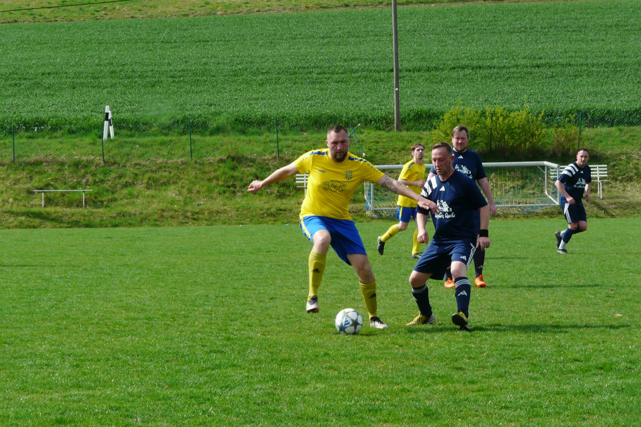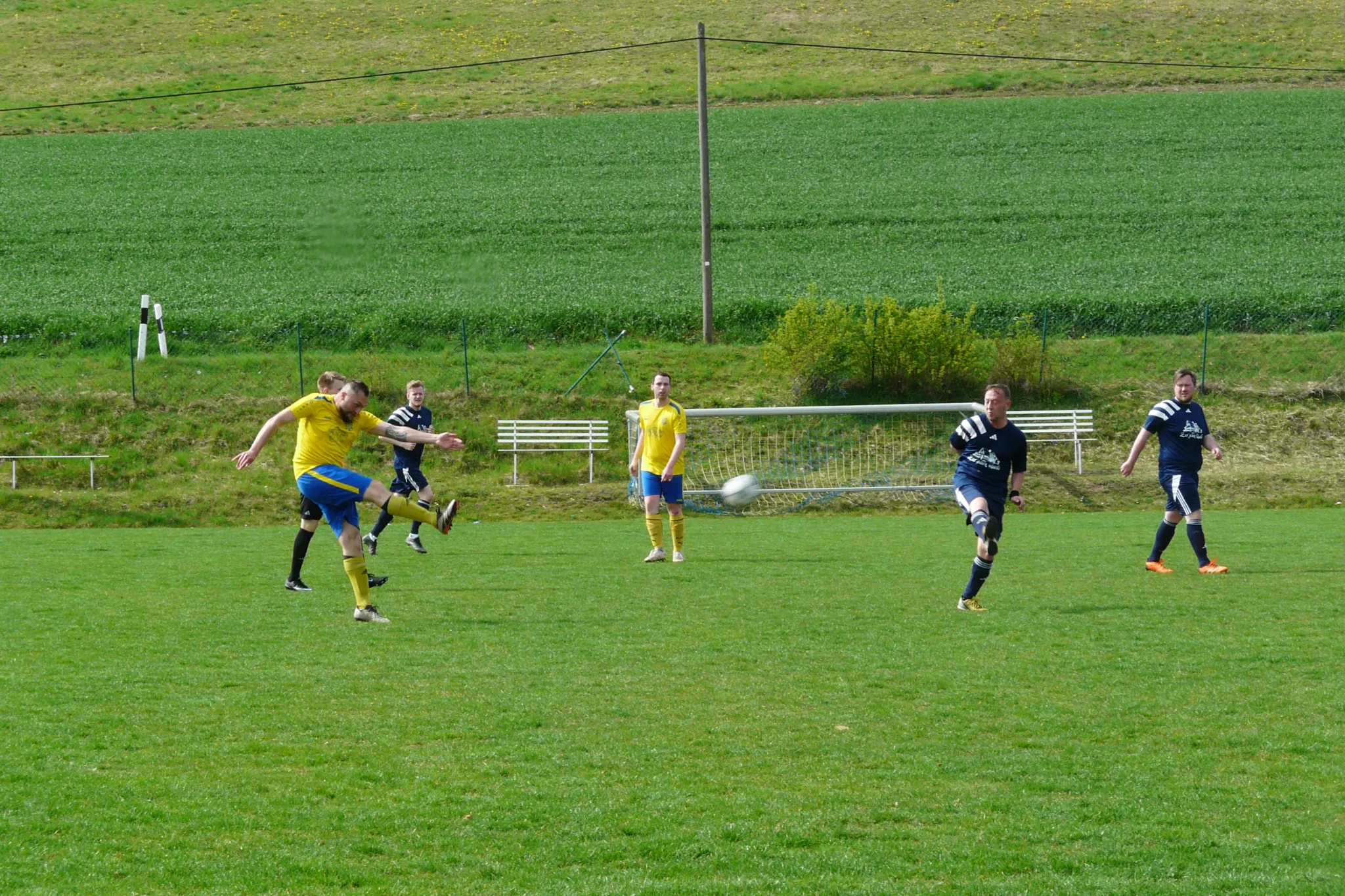 Hätte zum Gang in die Kabine lediglich eine „Eins“ vorne gestanden, wäre Reißigs Pausenansprache wohl deutlich unentspannter ausgefallen. So konnte er seine Jungs ermutigen, Kräfte zu bündeln, das nächste Tor zu erzwingen und gegen die schon jetzt konditionell angeschlagenen Gäste für eine Entscheidung zu sorgen. Dennoch sollte alle Eckardtshäuser gewarnt sein: Ein Gegentor reichte im Oktober, um ungeahnte Motivation freizusetzen; man erinnere sich an das Hinspiel, bei dem die Geißrainer mit 4:0 zur Halbzeit führten und am Ende nur hauchdünn 4:3 siegten – an diesem sonnigen Samstagnachmittag sollte alles anders kommen. Mit dem ersten Torschuss des zweiten Durchgangs veredelte Daniel Hering einen tollen Laufpass von Dominik Kaßner zum 4:0 (48.). Der nächste Angriff resultierte in einem Fußtreffer an Benjamin Zirpel. Mit einem platzierten Schuss vom Elfmeterpunkt schraubte der Gefoulte höchstpersönlich sein Torkonto an Pflichtspieltreffern auf 199 (5:0/50.). Mit Tom Haide und Tobias Hüttig wirbelten nun zwei frische Kräfte offensiv mit und sahen, wie Daniel Hering binnen sechs Minuten seinen Hattrick erzielte. Erst war er Nutznießers von Zirpels Querpass und ließ mit strammen Schuss Dietzel keine Chance (6:0/59.). Anschließend drückte Hering eine seitenverlagernde Flanke des umtriebigen Toni Berndts mit der Innenseite ins Netz (7:0/65.). Mittlerweile hatte auch auf dem Sportplatz die Runde gemacht, dass Benjamin Zirpel sehr nah dran an seinem 200. Jubiläumstreffer sein könnte. Als gerade ein Blick in die Statistik erfolgte, war es auch schon soweit: Tobias Hüttig, tagszuvor noch Torschütze bei den Alten Herren, legte für Zirpel auf, dessen Flachschuss mit der Innenseite in die rechte Ecke nicht typischer hätte fallen können (8:0/67.). Gratulation, lieber Benni! Allein in Pflichtspielen 200 Treffer zu erzielen, ist eine Zahl, die perspektivisch unüberbietbar zu sein scheint und zeigt, wie wichtig Benni in den letzten 18 Jahren für unseren Verein ist und war. Ein „Best Of“ würde ein breites Repertoire an direkten Freistoßtoren, Direktabnahmen, platzierten Elfmetern, vereinzelt auch Kopfballtreffern und vor allem einem immer bescheiden gebliebenen Benni in blau-gelbem Trikot zeigen. Nicht weniger umjubelt war das neunte Tagestor, bei dem Tom Haide Nutznießer von Steven Neumanns missglücktem Annahmeversuch am langen Eck war. Der Joker hielt seinen Schlappen dran und sorgte für „Haides Zweites“ im Eckardtshäuser Trikot (9:0/70.). Langsam, aber sicher, näherten sich die Geißrainer einem fast schon unheimlichen Torlauf. Meimers war offensiv abgemeldet und gegen den Ball kaum noch anwesend. Wieder boten sie auf Linksaußen Steven Neumann zu viel Platz, dessen Seitenwechsel genau bei Daniel Hering landete und seinem Viererpack binnen 23 Minuten den Weg bereitete (10:0/71.). Ein Handspiel sorgte für den nächsten Strafstoßpfiff, zu dem sich Tommy Mengis in die Torschützenliste eintragen und sein Elfertrauma von Kaltenlengsfeld besiegen wollte. Gesagt, getan, 11:0 (77.). Da war sie nun, die magische Zahl; jene Schallmauer, der es keiner Geißrainer Mannschaft in einem Pflichtspiel gelang, zu durchbrechen. Und es schien wieder auf dieses Szenario hinauszulaufen. Ein Zirpel-Freistoß klatschte an den Querbalken, Herings Nachschuss schellte ebenfalls am Aluminium (81.). Drei Minuten vor dem Schlusspfiff geschah es aber doch noch, als sich nämlich der trotz etwas Pech am Schuh 90 Minuten lang rackernde Steven Neumann als siebter Tagestorschütze erfolgreich war und den Torrekord von elf Treffern brach (12:0/87.).